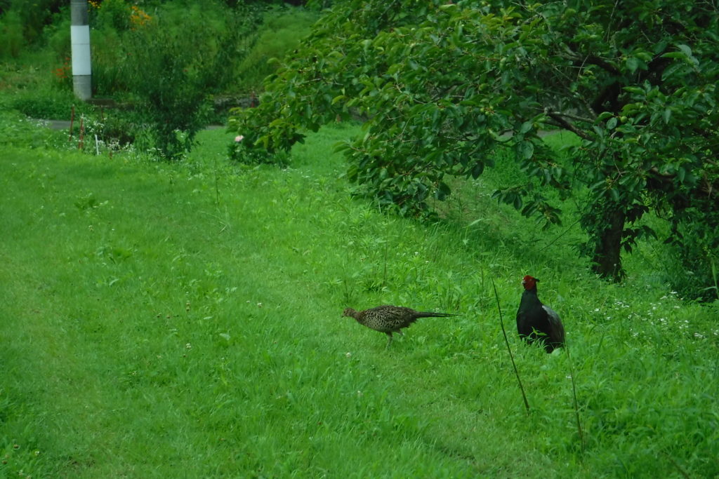 雨の中,辨海神社からの帰り道でした。普段はすぐに逃げ出すのですが,軽トラに乗っているせいか近づいても落ち着いています。仲良く小道を横断して行きました。