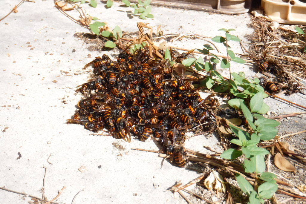 その後も飛んできたオオスズメバチが粘着シートに着地してはもがいて落下していました。
